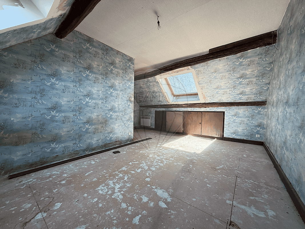 À l’étage, une grande chambre lumineuse d’environ 15 m², avec placards de rangement en sous-pente et un accès au grenier depuis ce niveau.