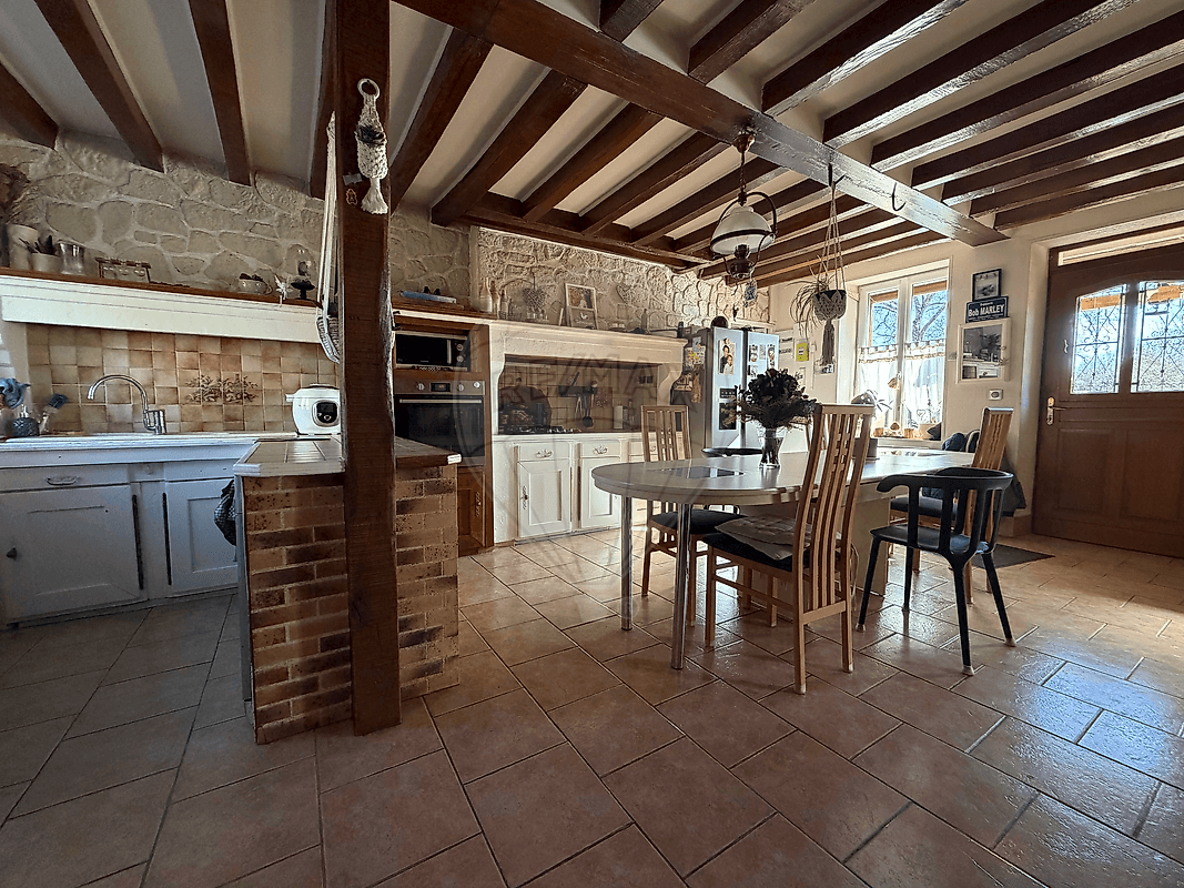 Dès l’entrée, vous découvrirez une spacieuse salle à manger avec cuisine lumineuse de plus de 30 m², ainsi qu’un séjour de 30 m² équipé d’un insert bois renforçant le caractère chaleureux de la pièce. La luminosité est traversante et le salon donne accès à une véranda de 25 m², idéalement exposée, ouverte sur l’extérieur.